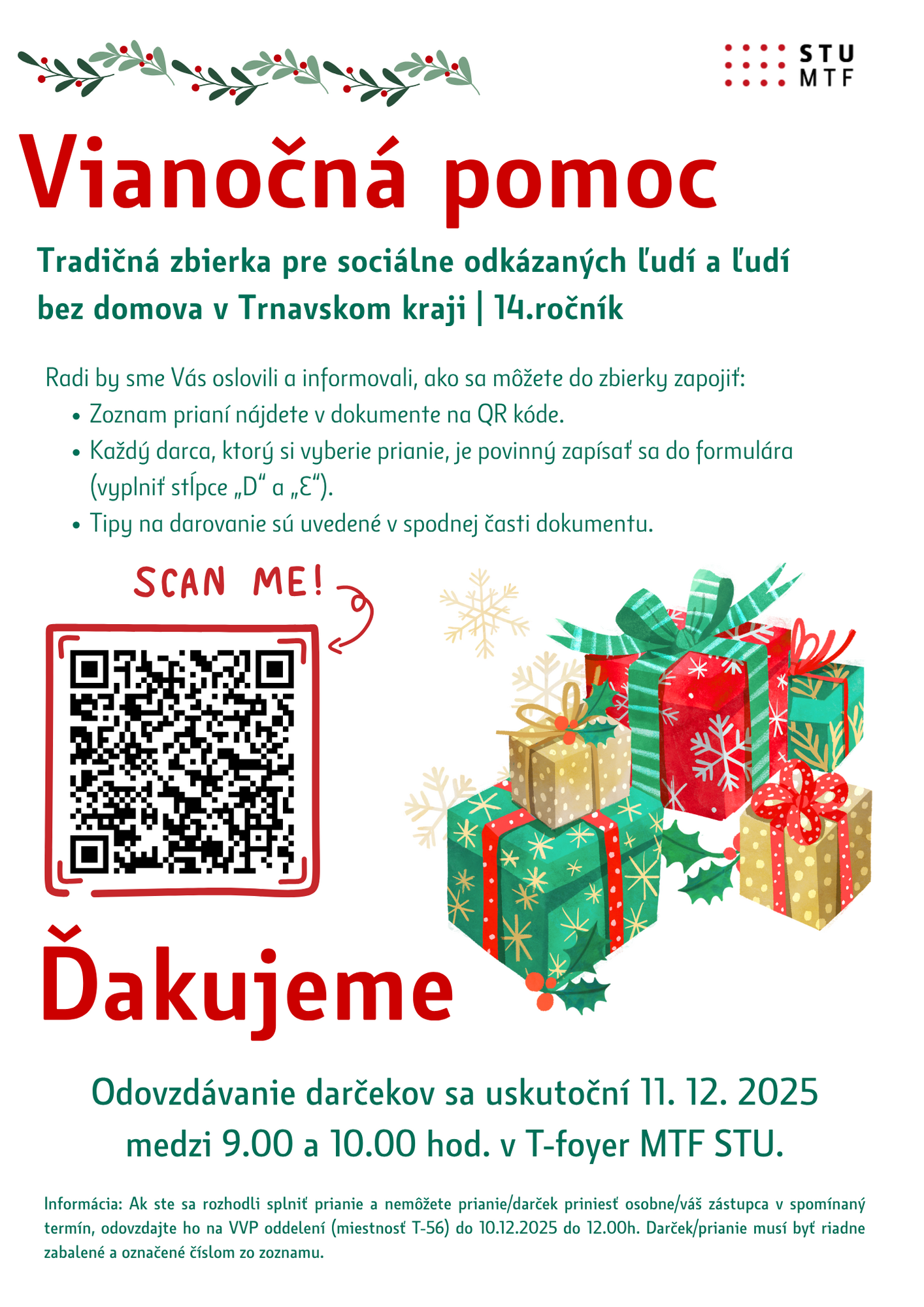 Odovzdávanie darčekov sa uskutoční 11. 12. 2025 medzi 9.00 a 10.00 hod. v T-foyer MTF STU za prítomnosti zástupcov Trnavskej arcidiecéznej charity, ktorí odovzdajú vaše dary obdarovaným. Prosíme darcov, aby darčeky priniesli do foyer T v uvedenom čase – vaša účasť je žiadaná a vítaná, prípadne môžete pomôcť aj ako dobrovoľníci pri odovzdávaní.