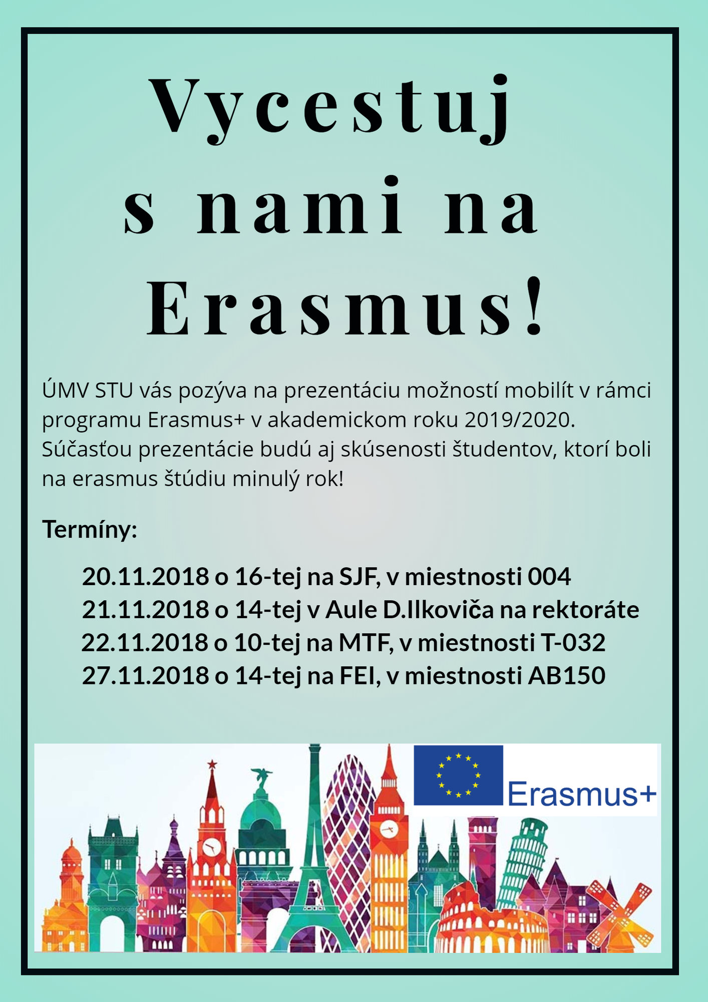 Útvar medzinárodných vzťahov STU Vás pozýva na na prezentáciu možností mobilít v rámci programu Erasmus+ v akademickom roku 2019/2020.