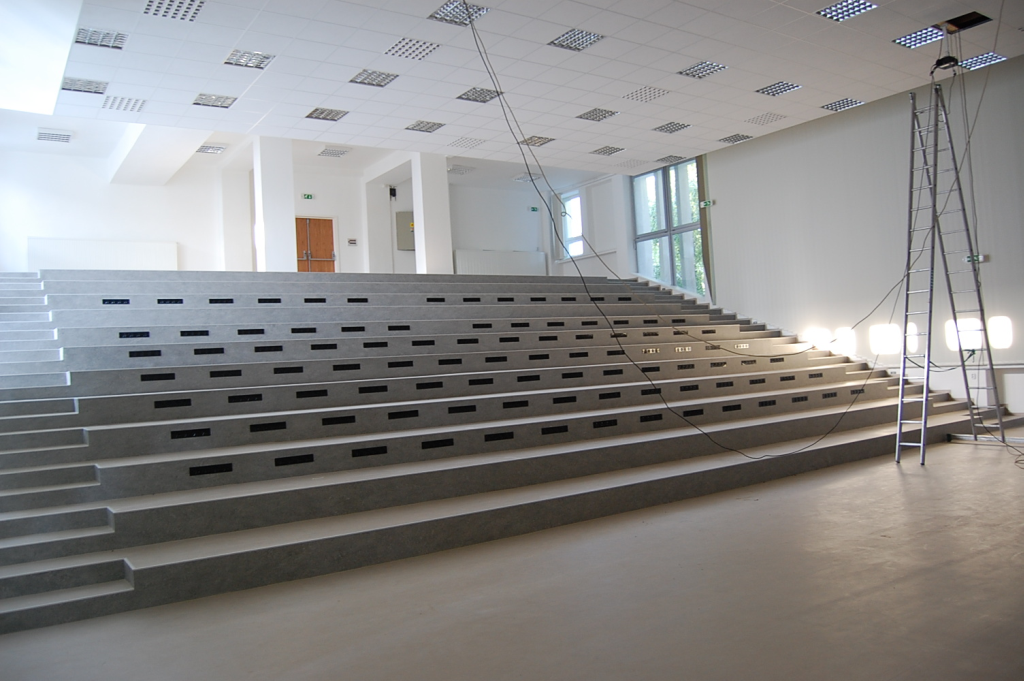 V letných mesiacoch pokračujú rekonštrukčné práce na pavilóne T na Bottovej ul. Prinášame vám najnovšie zábery z takmer dorobenej malej auly (bývalá miestnosť č. 103):