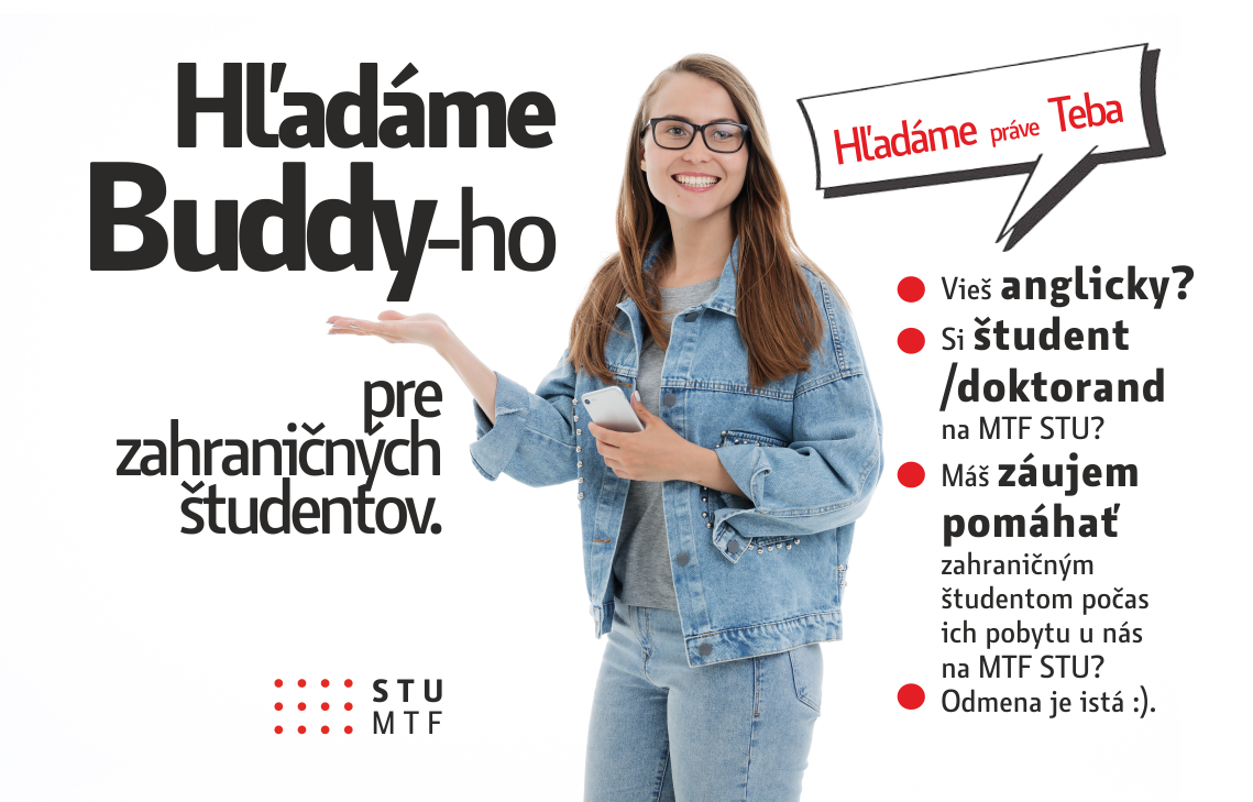 Si študent/ doktorand na MTF STU, rád spoznávaš nových ľudí a chceš si zlepšiť angličtinu? Ak si odpovedal áno a mal by si záujem pomáhať zahraničným študentom počas ich pobytu u nás na MTF STU, tak hľadáme práve Teba.