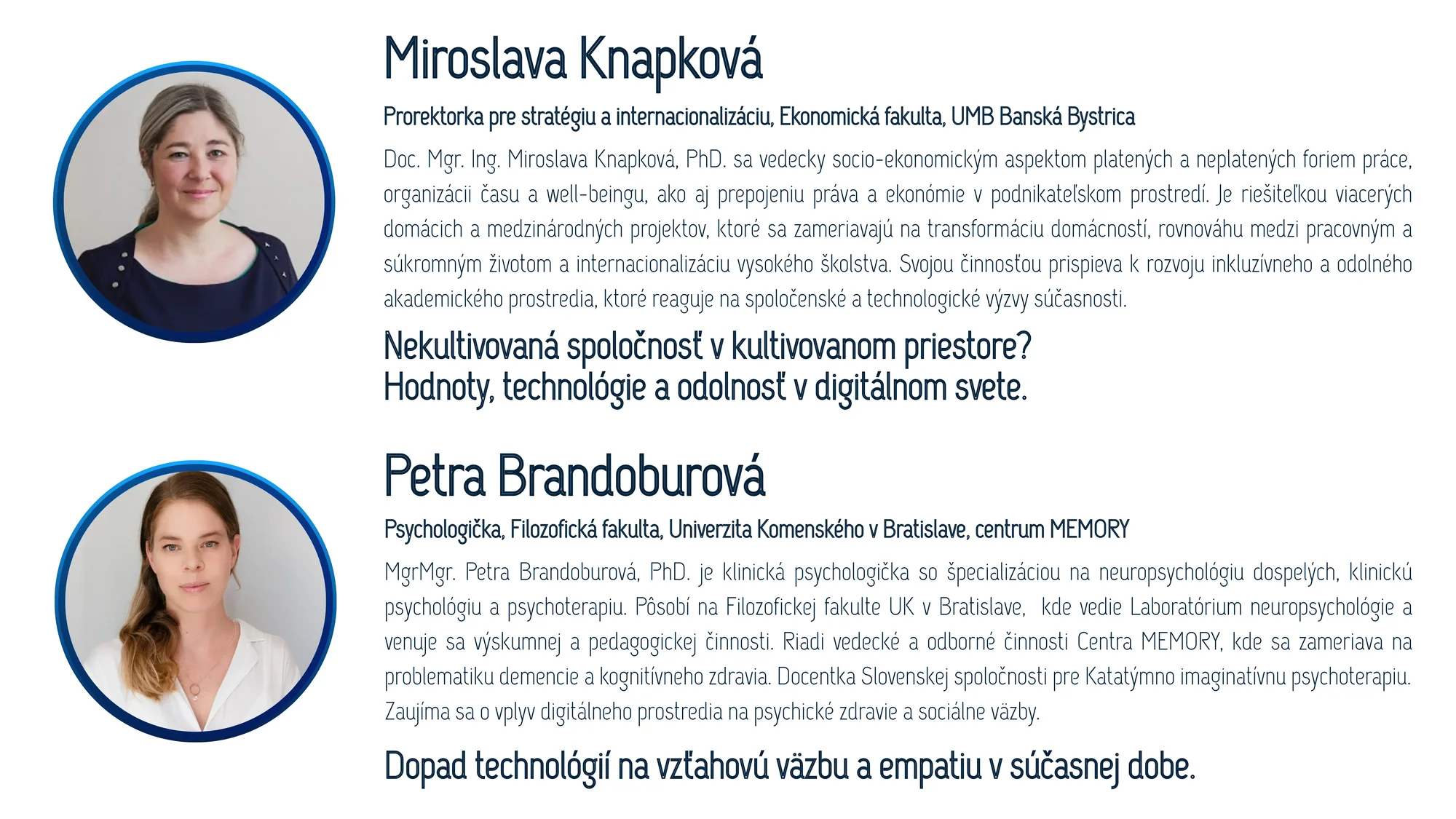 Podujatie spája odborníkov z oblasti psychológie, neurovedy, AI, technológií, etiky, vzdelávania aj kritického myslenia s cieľom podporiť diskusiu o vplyvoch digitalizácie na duševné zdravie, medziľudské vzťahy, vzdelávanie a spoločnosť.