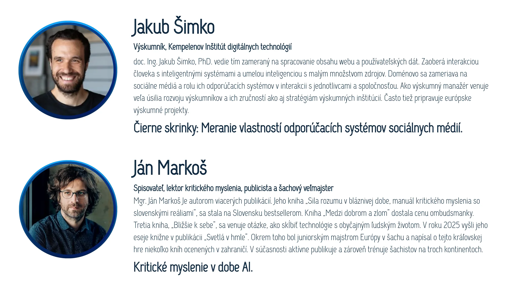 Záverečná diskusia otvorí otázky etiky, zodpovednosti, vzdelávania i duševného zdravia v digitálnej ére. Účastníci sa pokúsia načrtnúť scenáre, v ktorých technológie podporujú ľudský potenciál namiesto jeho nahrádzania, a budú hľadať rovnováhu medzi technologickým pokrokom a zachovaním ľudskej autonómie. (všetci hostia)